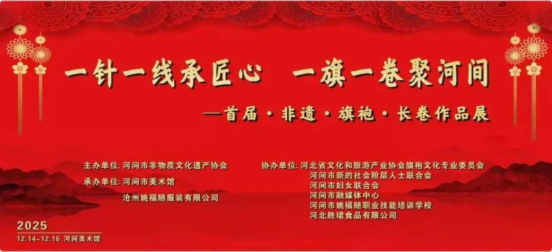 2025年12月14日至16日,由河间市非物质文化遗产协会主办,河间市美术馆、沧州姚福随服装有限公司承办的首届非遗旗袍长卷作品展,将在河间市美术馆隆重举行。